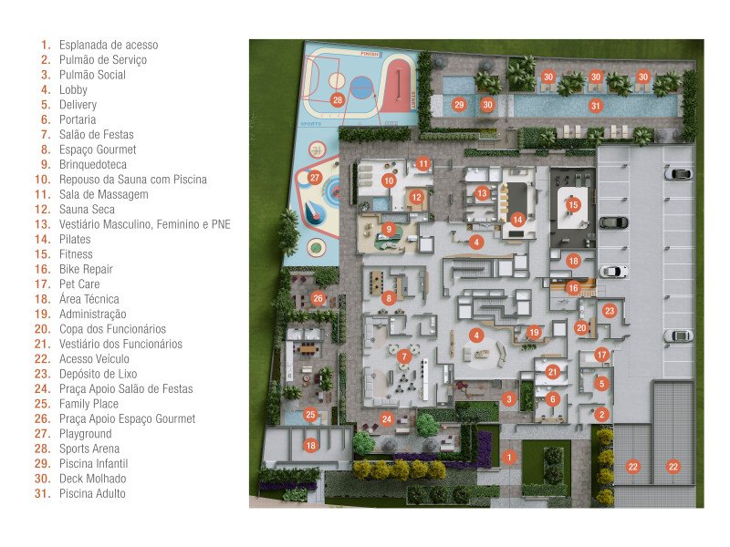 Academia, Água Quente, Área de Serviço, Bicicletário, Brinquedoteca, Churrasqueira, Elevador, Espaço de Beleza, Espaço Gourmet, Garagem, Internet Banda Larga, Jardim, Lounge, Permite Animais, Piscina, Playground, Portaria 24 Horas, Sacada com Churrasqueira, Salão de Festas, Salão de Jogos, Sauna, SPA, Varanda