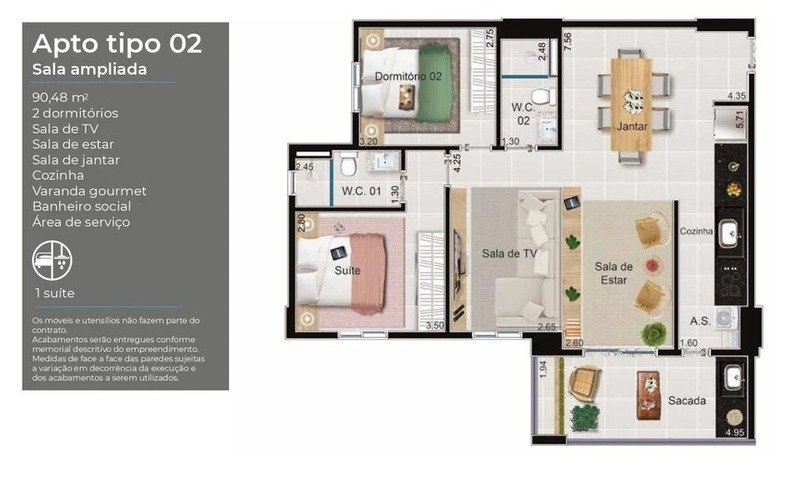 Espaço: Com 90,58m², o apartamento oferece um layout bem distribuído, com living amplo para três ambientes, ideal para receber amigos e familiares.