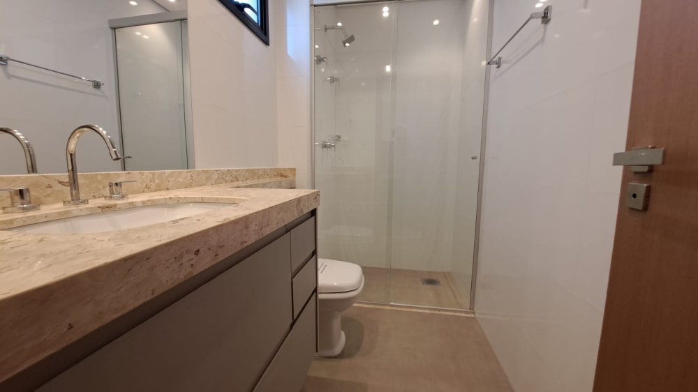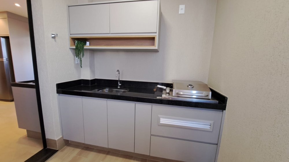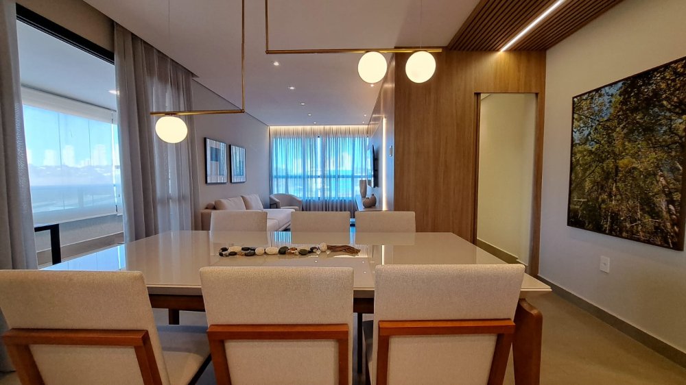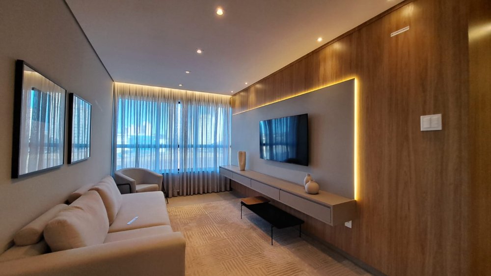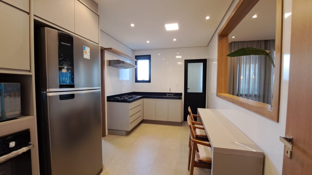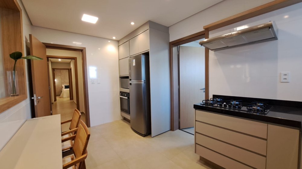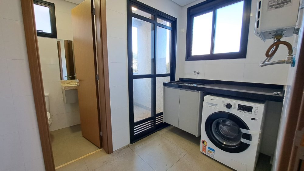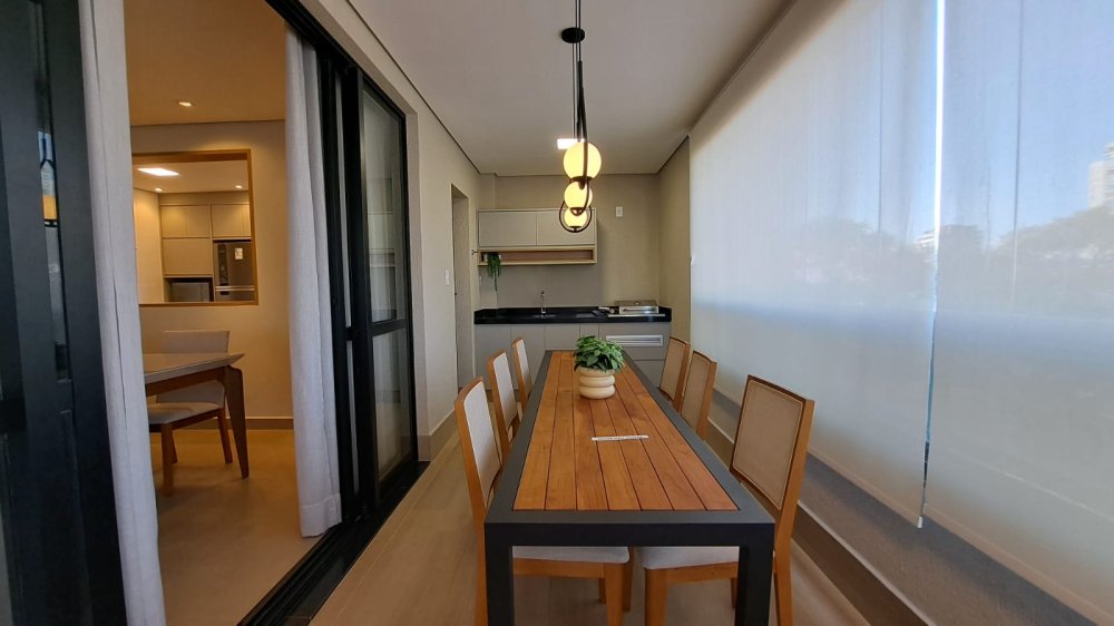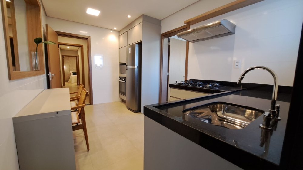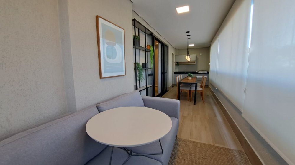A unidade possui uma planta inteligente composta por três salas integradas, lavabo e três suítes amplas. A cozinha segue o estilo americano, promovendo a integração com os demais ambientes sociais. A área de serviço é independente e o imóvel conta com sistema de aquecimento de água. Um dos grandes destaques é a varanda com churrasqueira, que proporciona uma vista panorâmica da região.