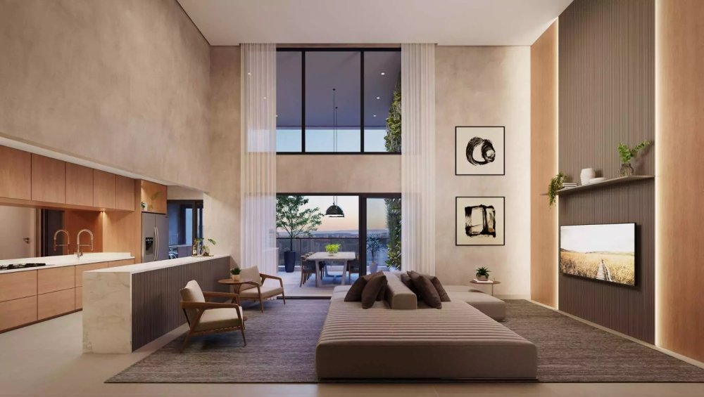 Living com pé direito duplo: Amplidão e elegância em um ambiente que convida a momentos inesquecíveis.