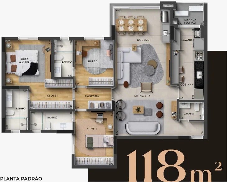 Com uma área privativa de 118m² distribuída de forma inteligente, o projeto valoriza a fluidez dos ambientes e a integração social. O apartamento dispõe de três salas que se conectam harmoniosamente à cozinha americana, criando um cenário ideal para momentos de convivência e hospitalidade. A área íntima é composta por três suítes plenas, projetadas para oferecer o máximo de privacidade e conforto térmico, contando com sistema de água quente em pontos estratégicos. A varanda e a sacada estendem a percepção de liberdade, permitindo que a luz natural e a ventilação sejam protagonistas no cotidiano dos moradores.