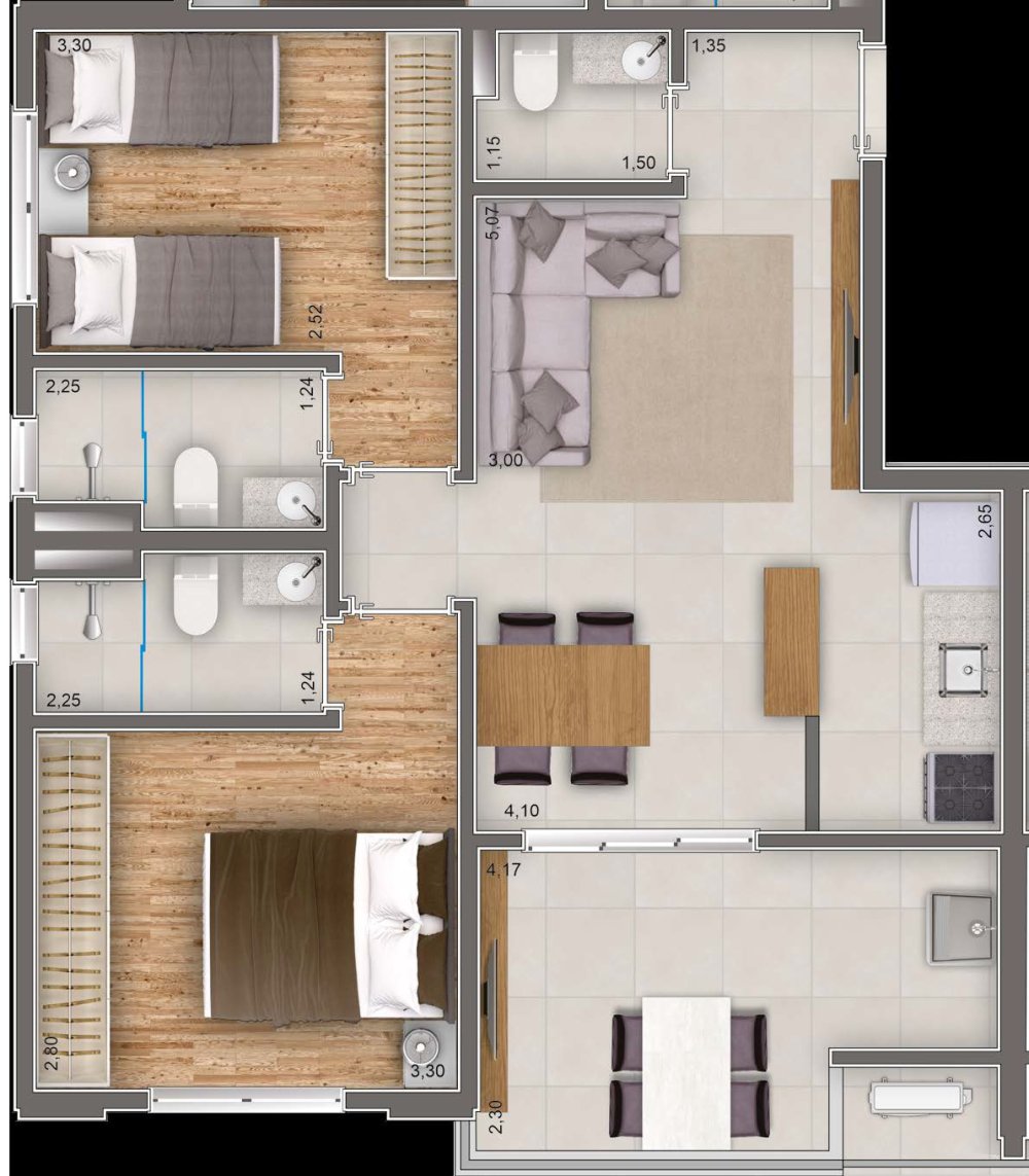 1 ou 2 suítes com lavabo, proporcionando flexibilidade e privacidade para você e sua família.