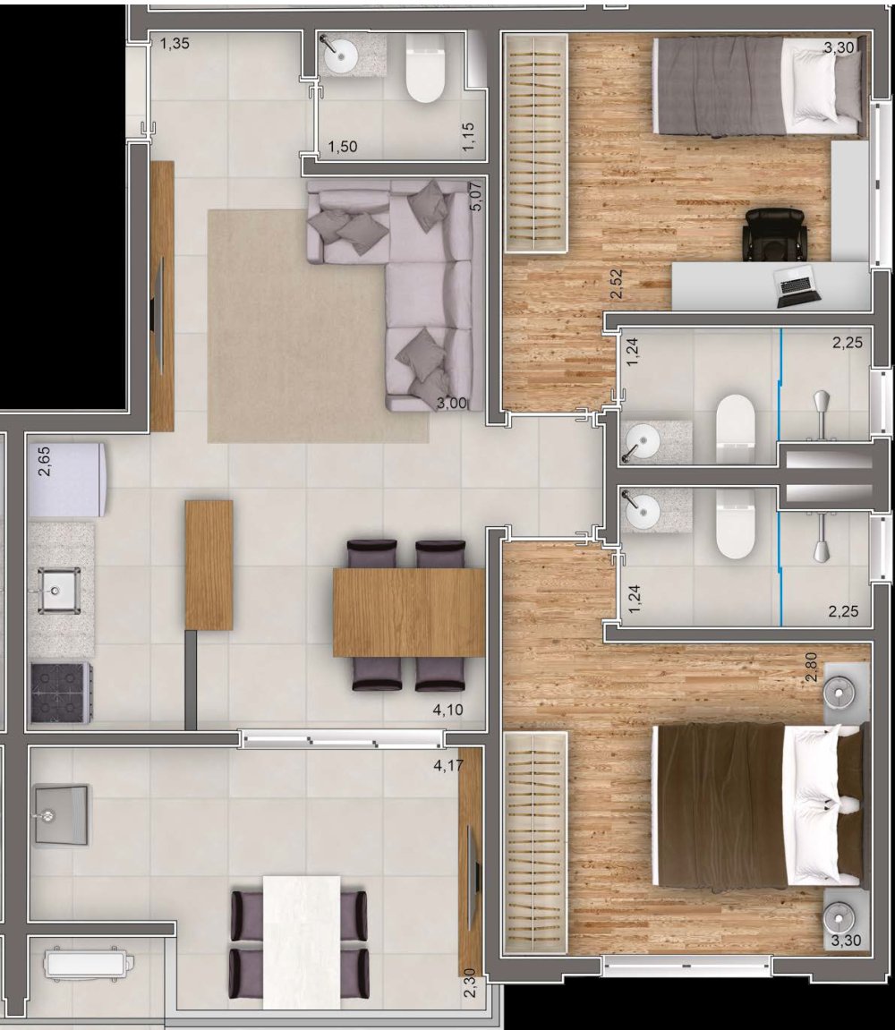 Os apartamentos contam com acabamentos de alta qualidade, que garantem durabilidade e beleza aos ambientes.