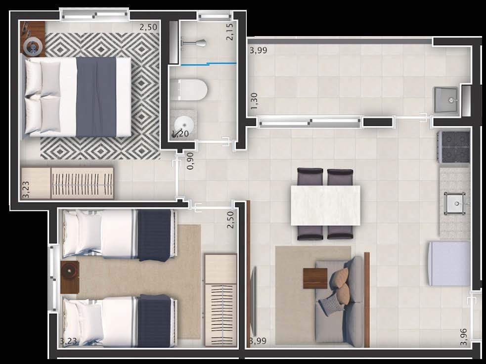 2 dormitórios: Apartamentos com 2 quartos, ideais para famílias pequenas ou casais.