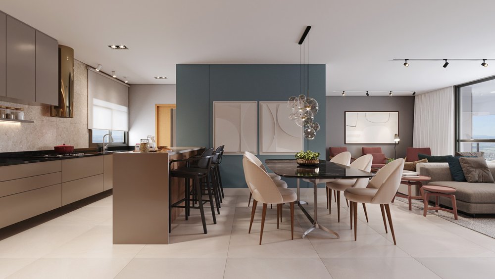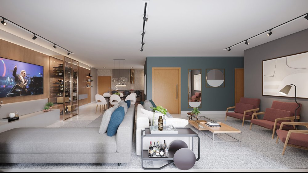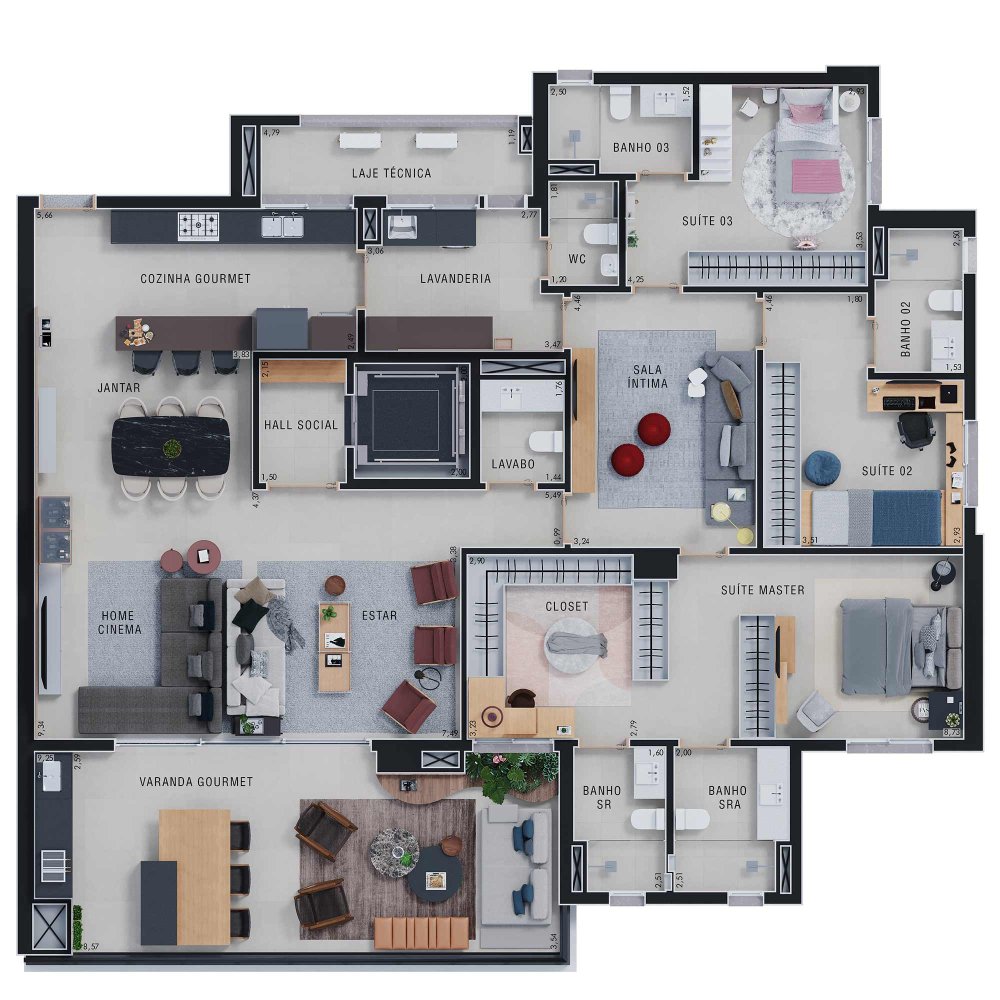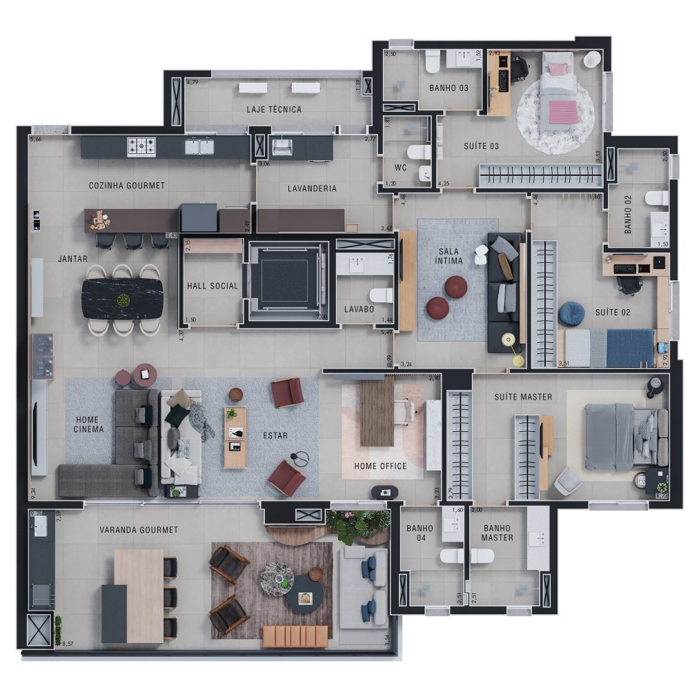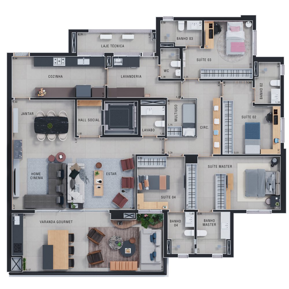O apartamento possui uma área privativa de 227,00 m², com planta estrategicamente distribuída para oferecer conforto e privacidade. A zona íntima é composta por 3 suítes amplas. A área social conta com 3 salas distintas, lavabo e uma varanda com sacada técnica equipada com churrasqueira, proporcionando uma vista panorâmica da região.