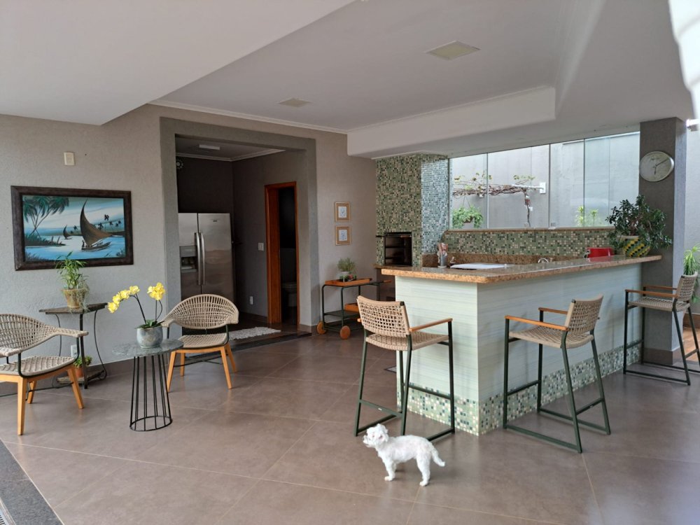 Área externa com churrasqueira, 2 banheiros e uma piscina salinizada