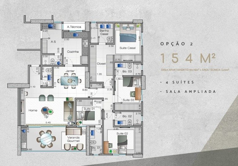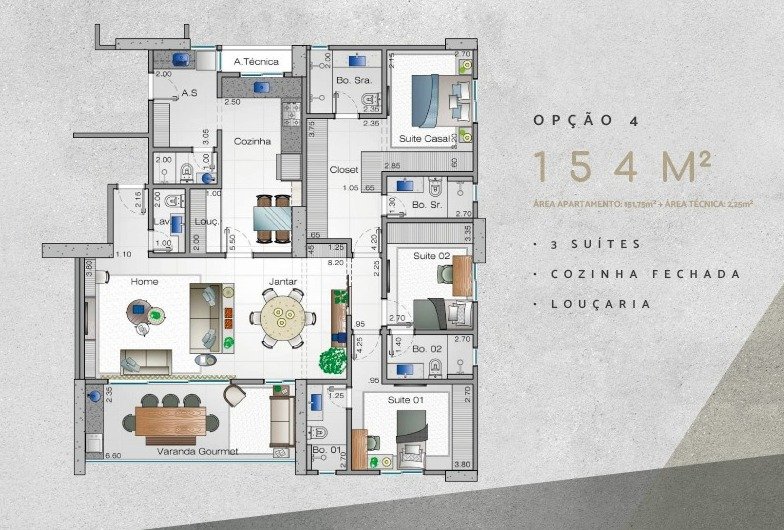 Oportunidade incrível de um apartamento à venda que vai te encantar! São 154m² de puro conforto e sofisticação, com opções de 3 ou 4 suítes, incluindo banheiros senhor/senhora e um closet espaçoso. A sala é ampla e perfeita para receber amigos, com uma varanda gourmet ideal para momentos de lazer. Além disso, o imóvel conta com lavabo, lavanderia, banheiro de serviço, laje técnica, e opções de planta com roupeiro ou escritório (office).