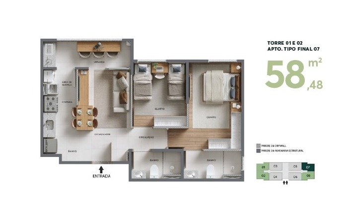 *2 dormitórios com suíte e varanda: 59,48 m²