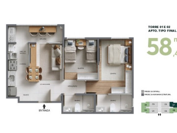 2 dormitórios com varanda 58,48m² e 59,48m²