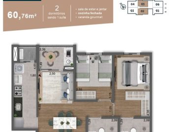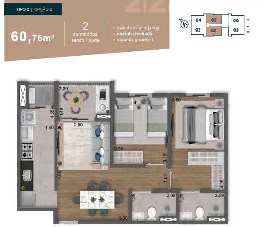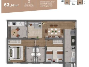 Com 60m² de área privativa, este apartamento foi cuidadosamente projetado para oferecer o máximo de aproveitamento do espaço. Desfrute de 2 dormitórios, incluindo uma suíte elegante, ideal para seus momentos de descanso. Os 2 banheiros garantem privacidade e conforto para toda a família.