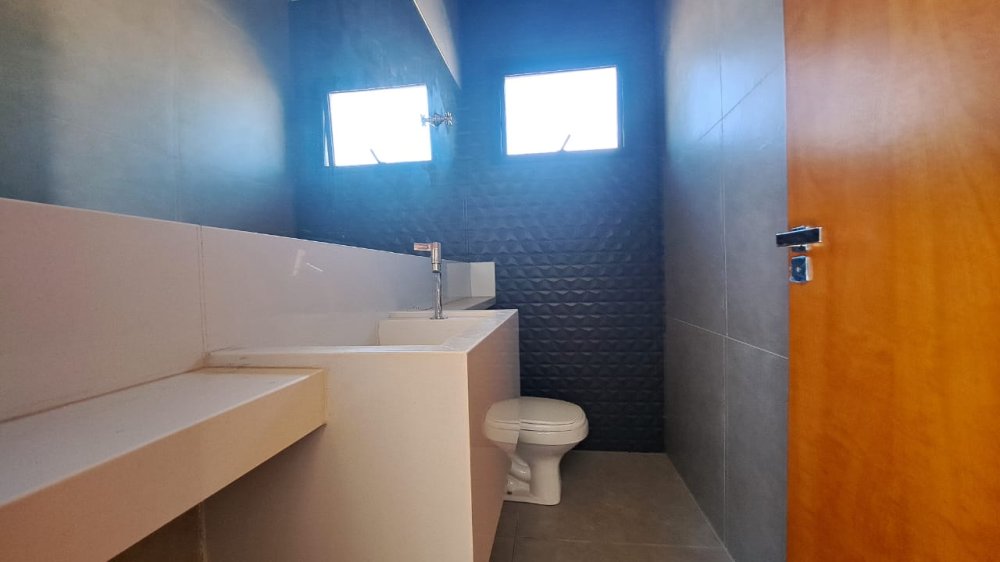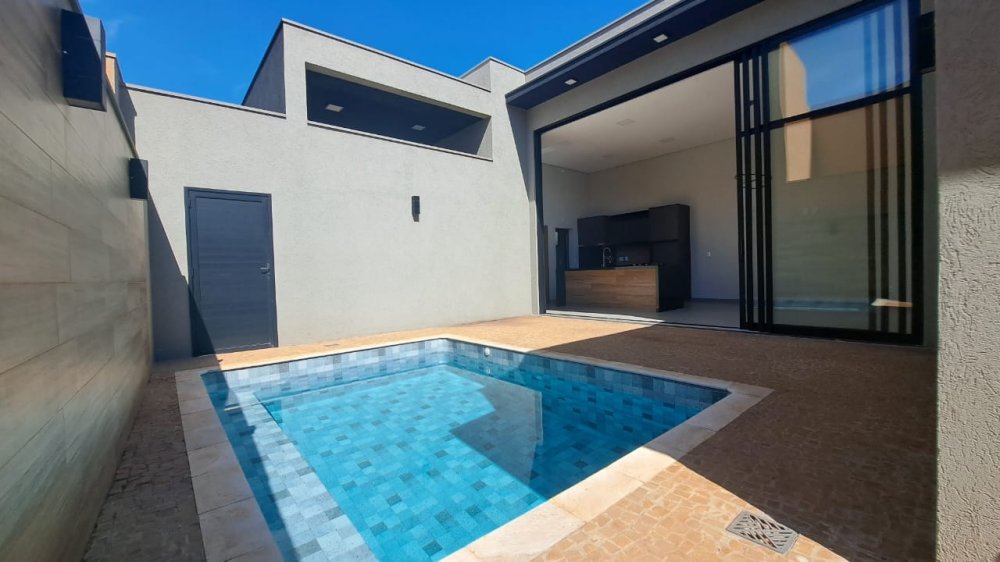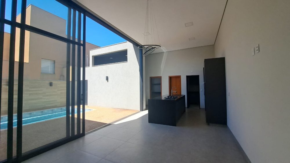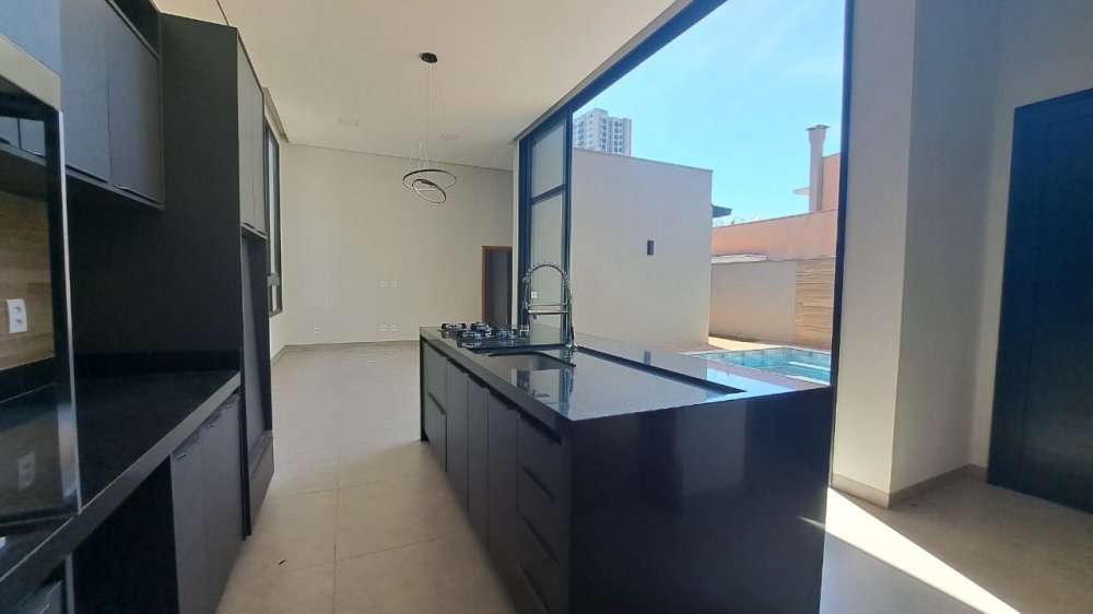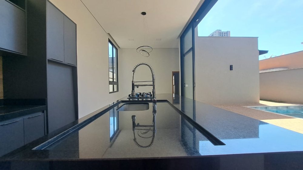 Casa térrea com 3 suítes, todas com armários embutidos, escritório, lavabo, cozinha gourmet completa com armários, churrasqueira braseiro com coifa de inox, área de serviço, piscina em vinil, sala 2 ambientes com pé direito de 4 metros, iluminação completa, box e espelhos, garagem 4 carros (2 cobertos e 2 descobertos).