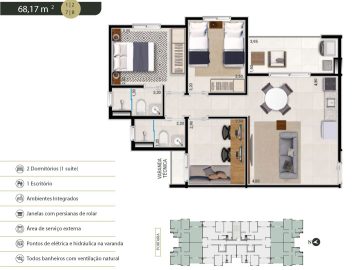 Localizado no andar, este apartamento de 2 dormitórios, sendo 1 suíte, foi projetado para o seu bem-estar. Desfrute de ambientes integrados, como a cozinha americana, que proporcionam um convívio agradável. A sacada e a varanda são convites para apreciar a vista panorâmica e relaxar ao ar livre.