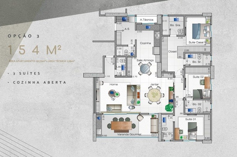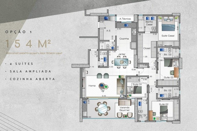 Oportunidade incrível de um apartamento à venda que vai te encantar! São 154m² de puro conforto e sofisticação, com opções de 3 ou 4 suítes, incluindo banheiros senhor/senhora e um closet espaçoso. A sala é ampla e perfeita para receber amigos, com uma varanda gourmet ideal para momentos de lazer. Além disso, o imóvel conta com lavabo, lavanderia, banheiro de serviço, laje técnica, e opções de planta com roupeiro ou escritório (office).