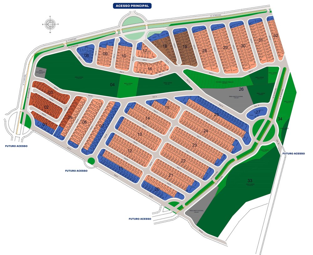 O projeto conta com lotes residenciais, comerciais e áreas destinadas a edifícios, prontos para receber o seu projeto de vida.