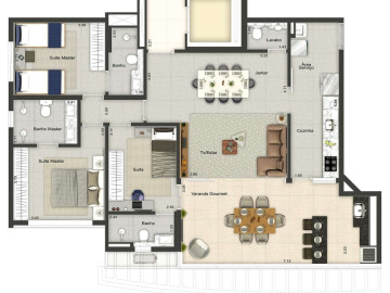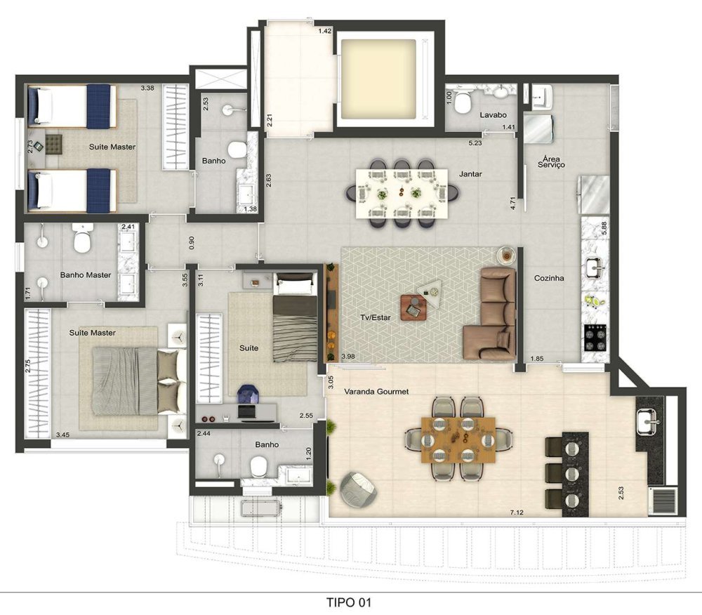 Com uma planta inteligente de 111 m² de área privativa, o imóvel foi projetado para valorizar a convivência e o conforto absoluto. A área social é composta por três ambientes de sala integrados, que se conectam harmoniosamente à cozinha americana, criando um espaço fluido e contemporâneo. A varanda gourmet, equipada com churrasqueira, torna-se o cenário ideal para momentos de descontração, unindo a praticidade do dia a dia ao prazer de receber amigos e familiares.