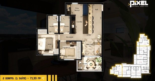 Com uma área privativa de 71 m², o apartamento destaca-se pela distribuição inteligente de seus espaços. A unidade dispõe de dois dormitórios, sendo uma suíte projetada para oferecer o máximo de privacidade e conforto. O living, composto por duas salas integradas, conecta-se harmoniosamente à cozinha americana e à área de serviço, promovendo uma sensação de amplitude e fluidez. O ponto alto da residência é sua varanda com vista panorâmica, um convite à contemplação e ao relaxamento em um ambiente reservado.