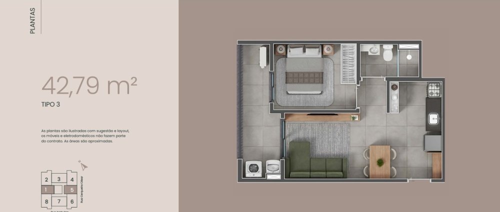 Cada unidade de 42m² foi meticulosamente planejada para maximizar o bem-estar. O dormitório único é um convite ao descanso, enquanto a sala de estar integra-se perfeitamente aos ambientes, criando uma sensação de amplitude e fluidez. O grande diferencial reside na sacada com churrasqueira, um espaço privativo pensado para momentos de contemplação e lazer, transformando o horizonte de Ribeirão Preto na extensão da sua sala.