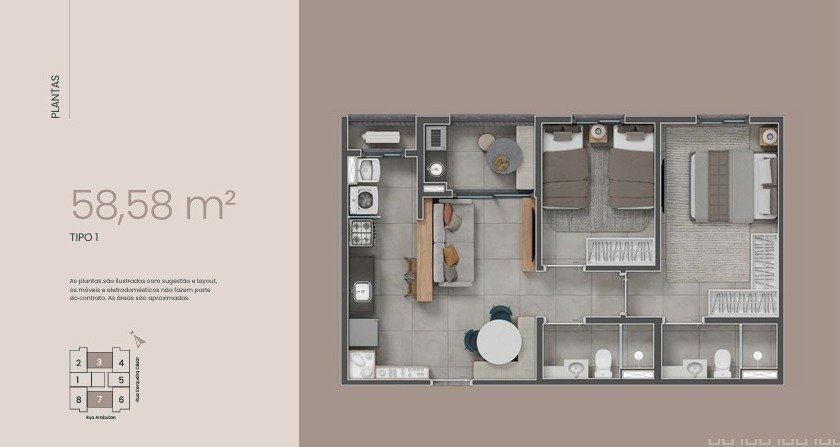 Cada unidade de 58 m² foi meticulosamente planejada para maximizar o bem-estar. Dois dormitórios sendo uma suíte é um convite ao descanso, enquanto a sala de estar integra-se perfeitamente aos ambientes, criando uma sensação de amplitude e fluidez. O grande diferencial reside na sacada com churrasqueira, um espaço privativo pensado para momentos de contemplação e lazer, transformando o horizonte de Ribeirão Preto na extensão da sua sala.