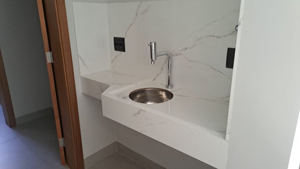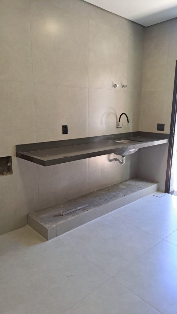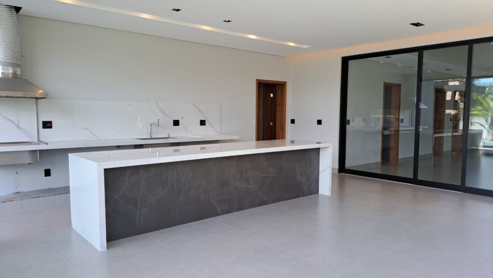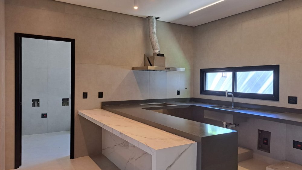 Iluminação com projeto luminotécnico instalado. Infra para Automação Eletrize com quadro de comandos, paisagismo, bancadas em quartzo e porcelanato, estrutura metálica, telhas termoacústicas (sanduíche), coifa e cubas de aço inox, metais Deca, fachada em pele de vidro, persianas automatizadas.