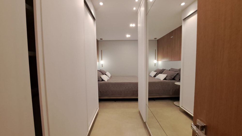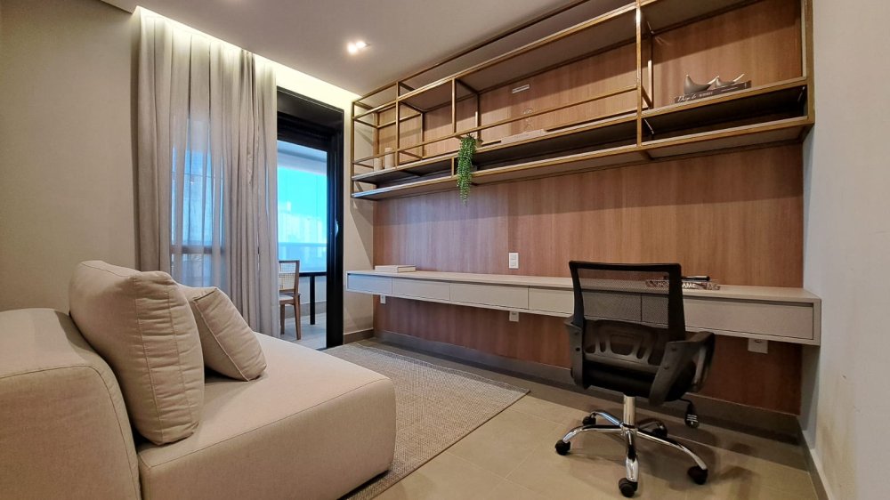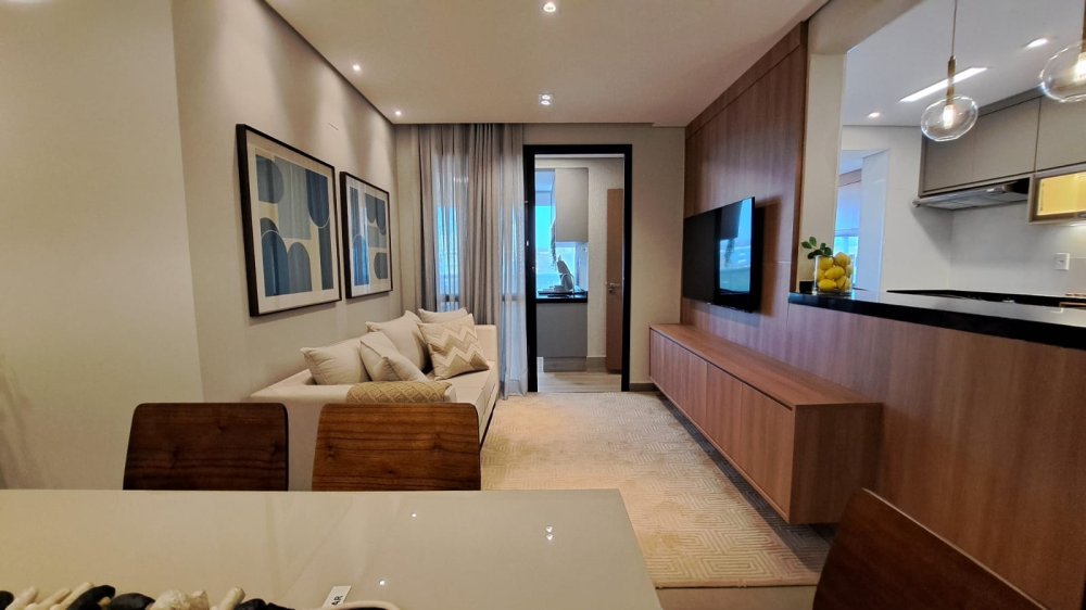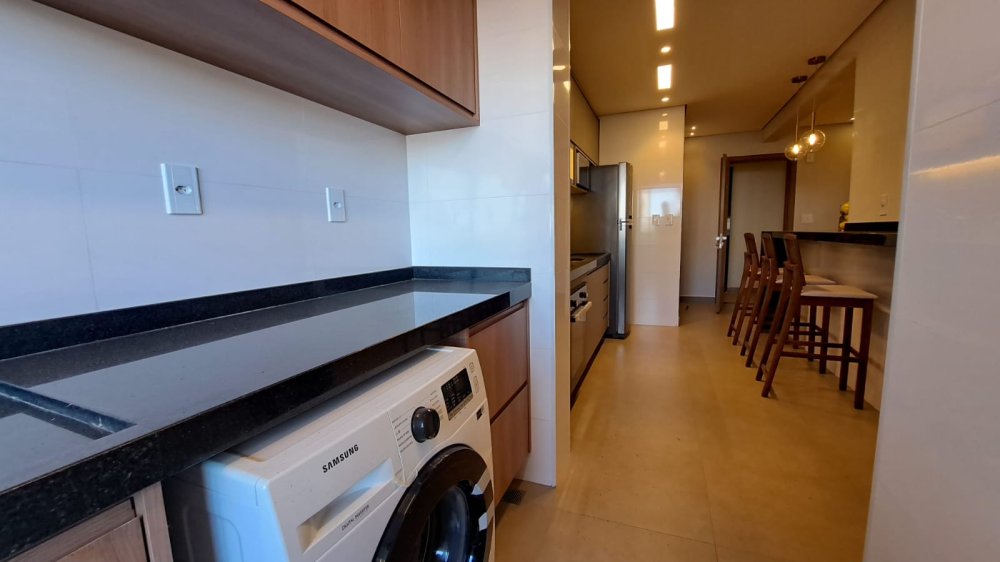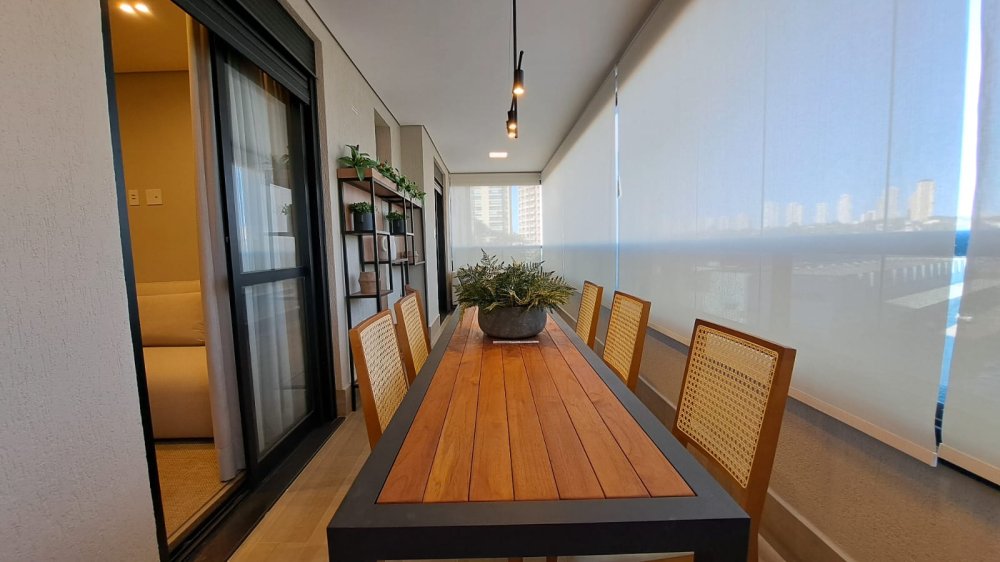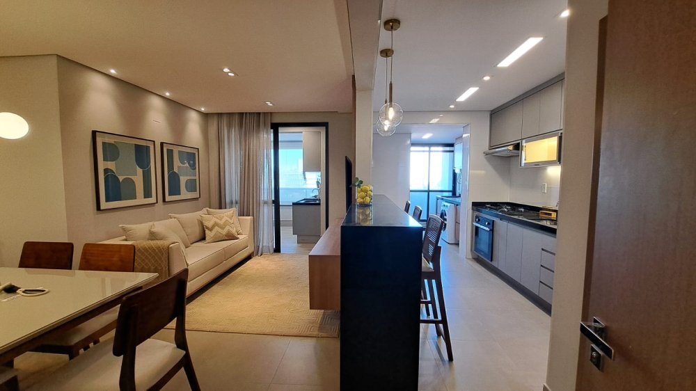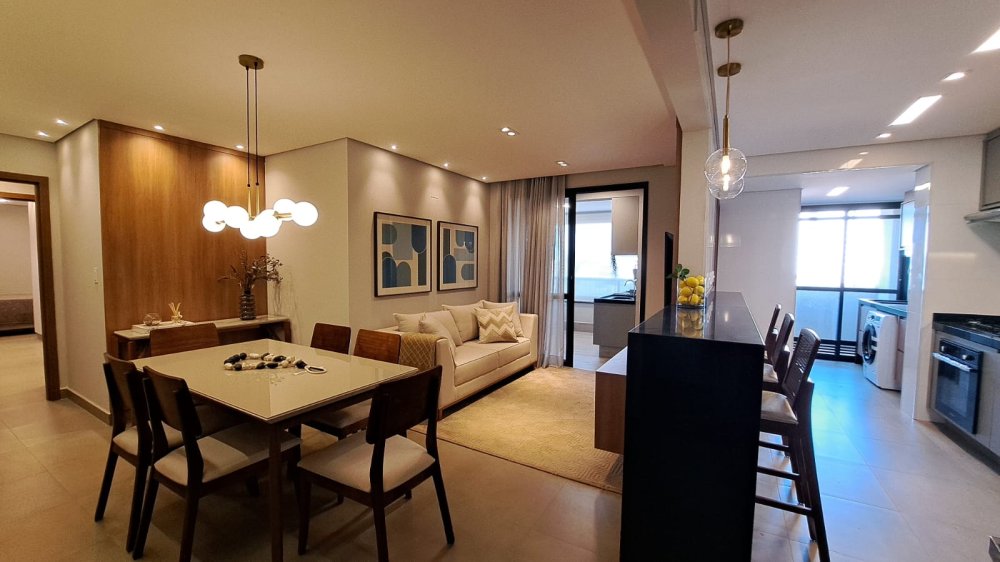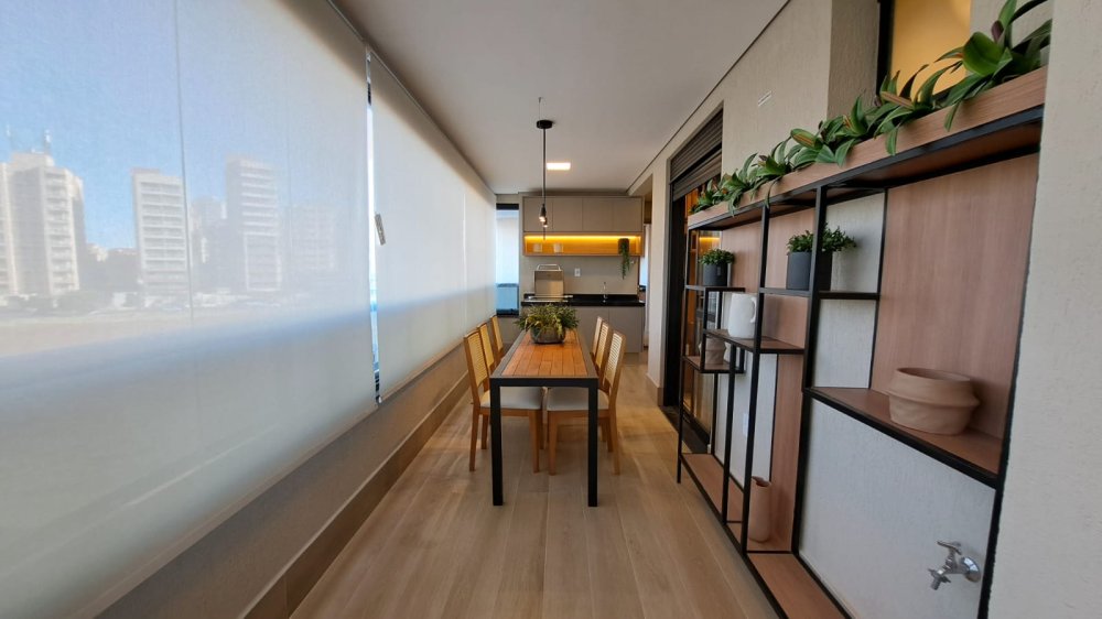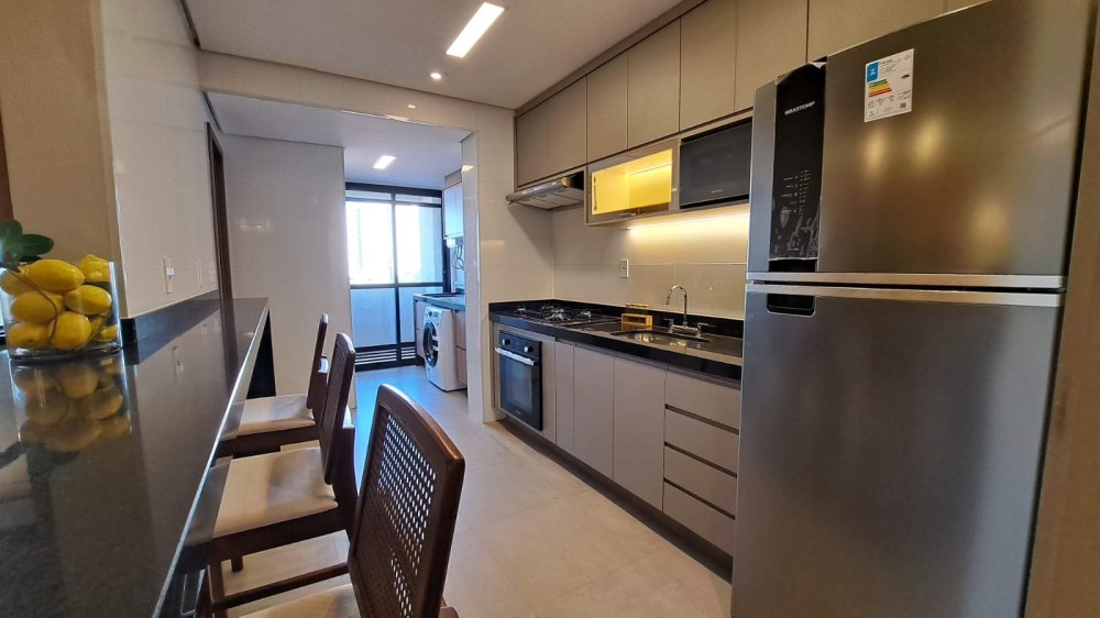 A cozinha americana integrada à área social é ideal para quem aprecia momentos de convívio e praticidade. A sacada com churrasqueira é um convite para desfrutar de momentos únicos com uma vista panorâmica da cidade.