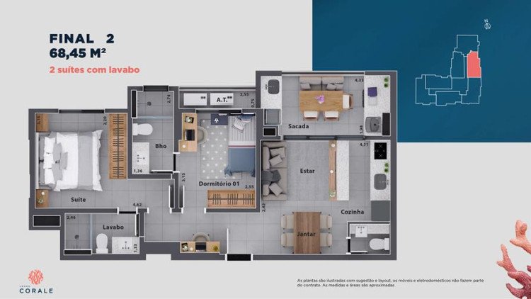 Área Total: 90 m² (R$ 6.611/m²)Área Privativa: 68 m²