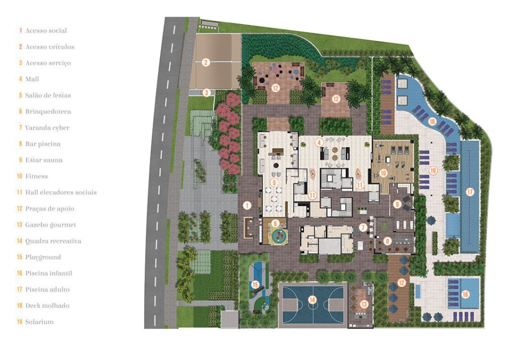 Academia, Água Quente, Área de Serviço, Área de Serviço com Banheiro, Bicicletário, Brinquedoteca, Churrasqueira, Dep. de Empregada com Banheiro, Elevador, Espaço Gourmet, Garagem, Jardim, Permite Animais, Piscina, Playground, Portaria 24 Horas, Quadra Poliesportiva, Sacada com Churrasqueira, Salão de Festas, Salão de Jogos, Sauna, SPA, Varanda, Vista Panorâmica