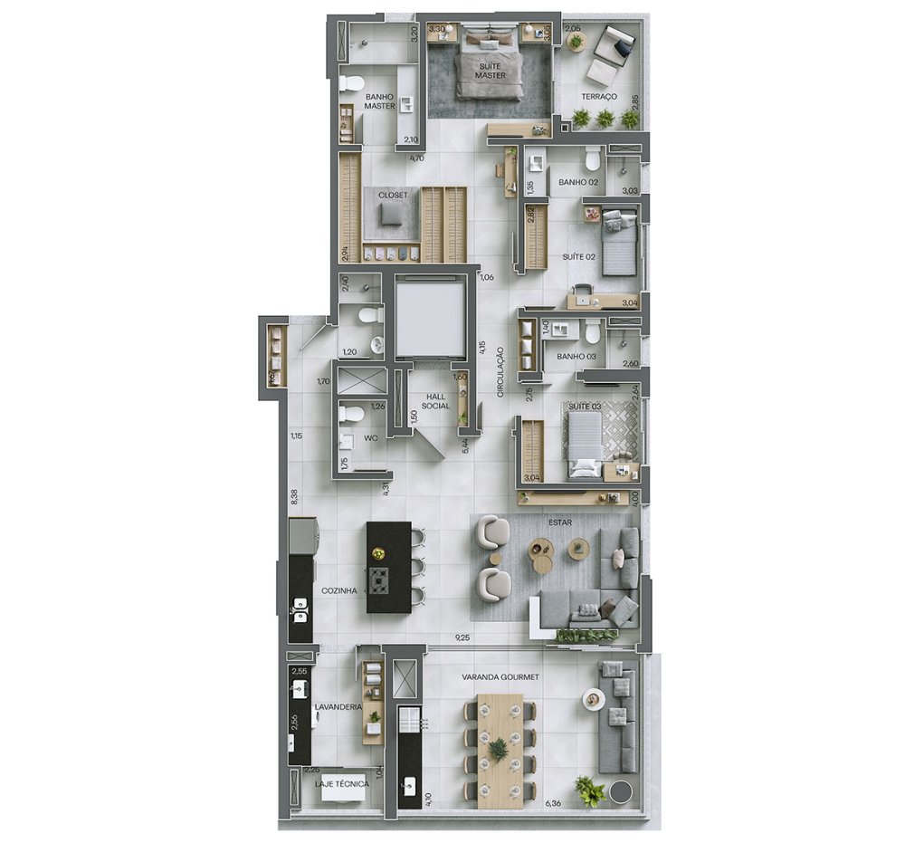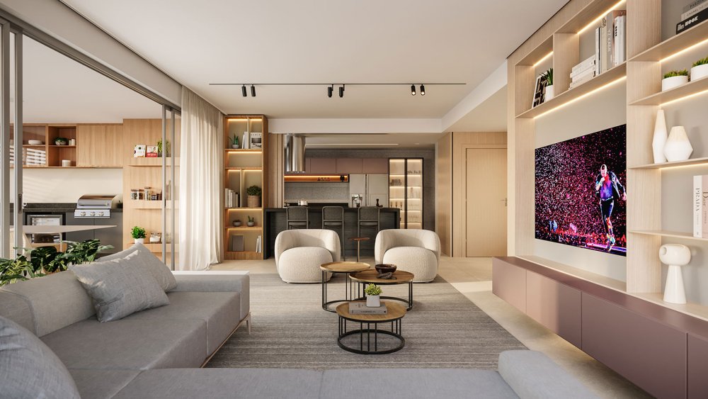 * Amplo living dividido em 3 ambientes distintos, proporcionando fluidez social.