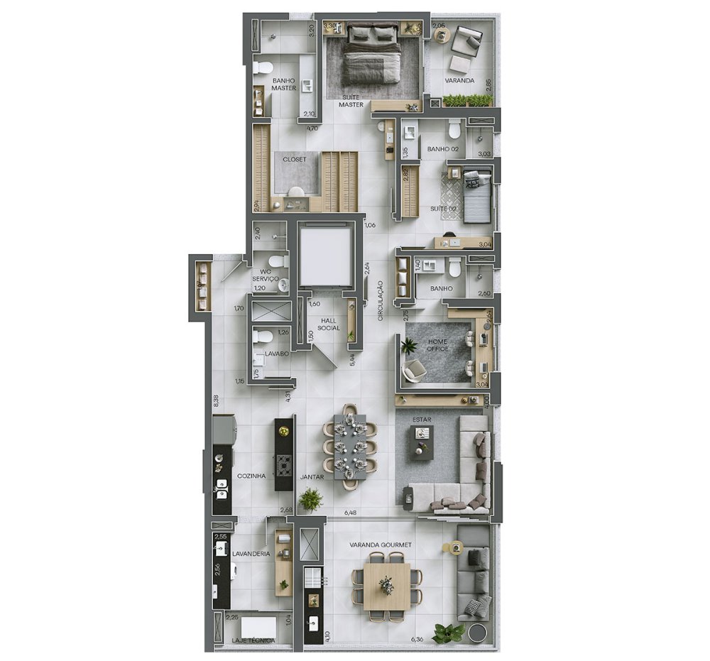 Cada apartamento dispõe de uma generosa área privativa de 188,00 m², planejada para atender aos mais exigentes padrões de conforto. A planta é distribuída de forma inteligente, compreendendo: